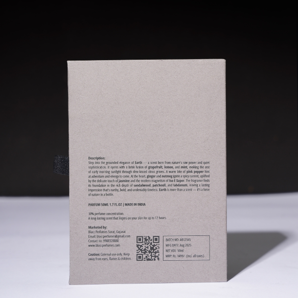 Step into the grounded elegance of Earth - a scent born from nature's raw power and quiet sophistication. It opens with a brisk fusion of grapefruit, lemon, and mint, evoking the zest of early morning sunlight through dew-kissed citrus groves. A warm bite of pink pepper hint at adventure and energy to come. At the heart, ginger and nutmeg ignite a spicy current, uplifted by the delicate touch of jasmine and the modern magnetism of Iso E Super. The fragrance finds its foundation in the rich depth of sandalwood, patchouli, and labdanum, leaving a lasting impression that's earthy, bold, and undeniably timeless. Earth is more than a scent - it's a force of nature in a bottle.